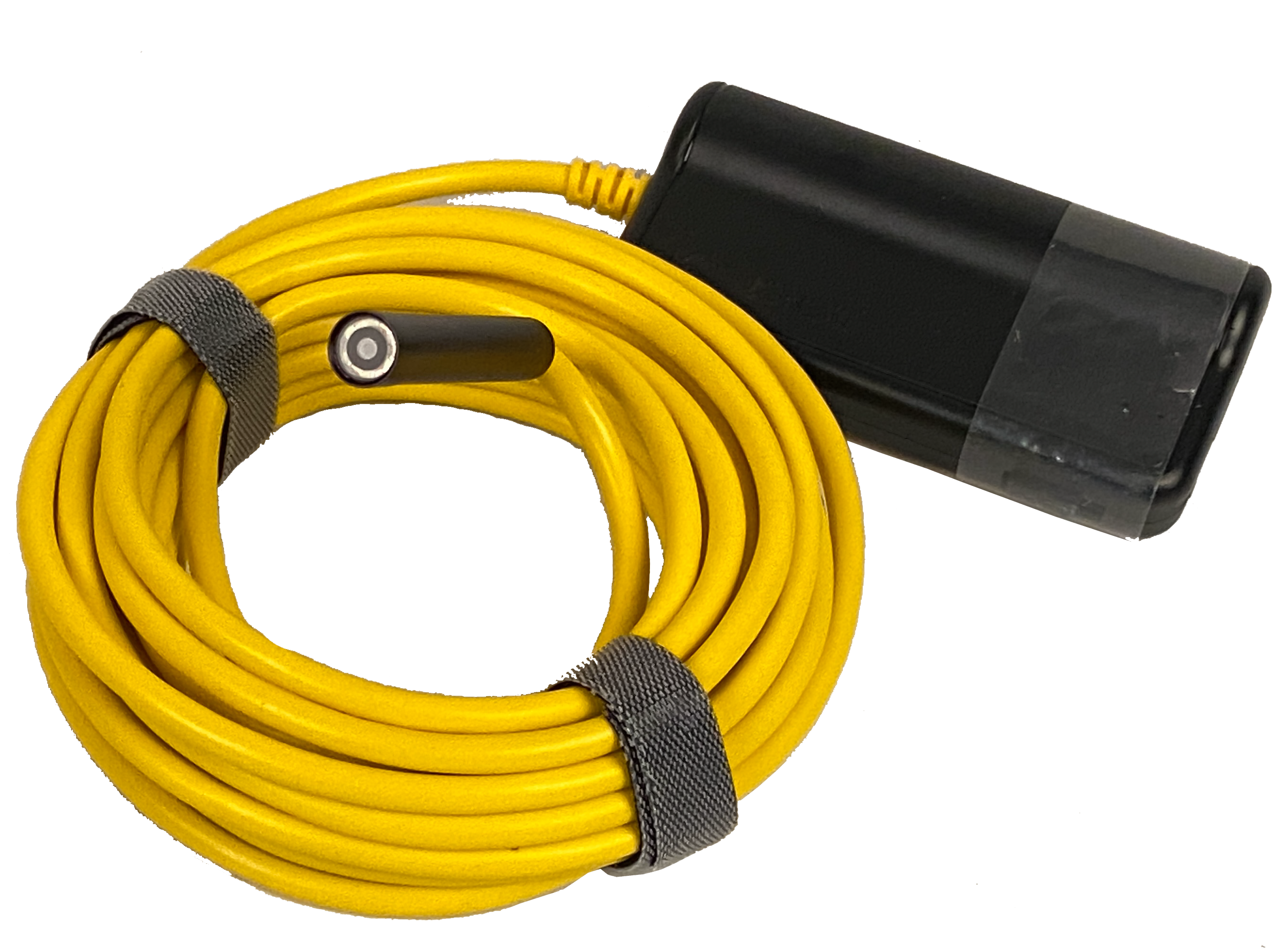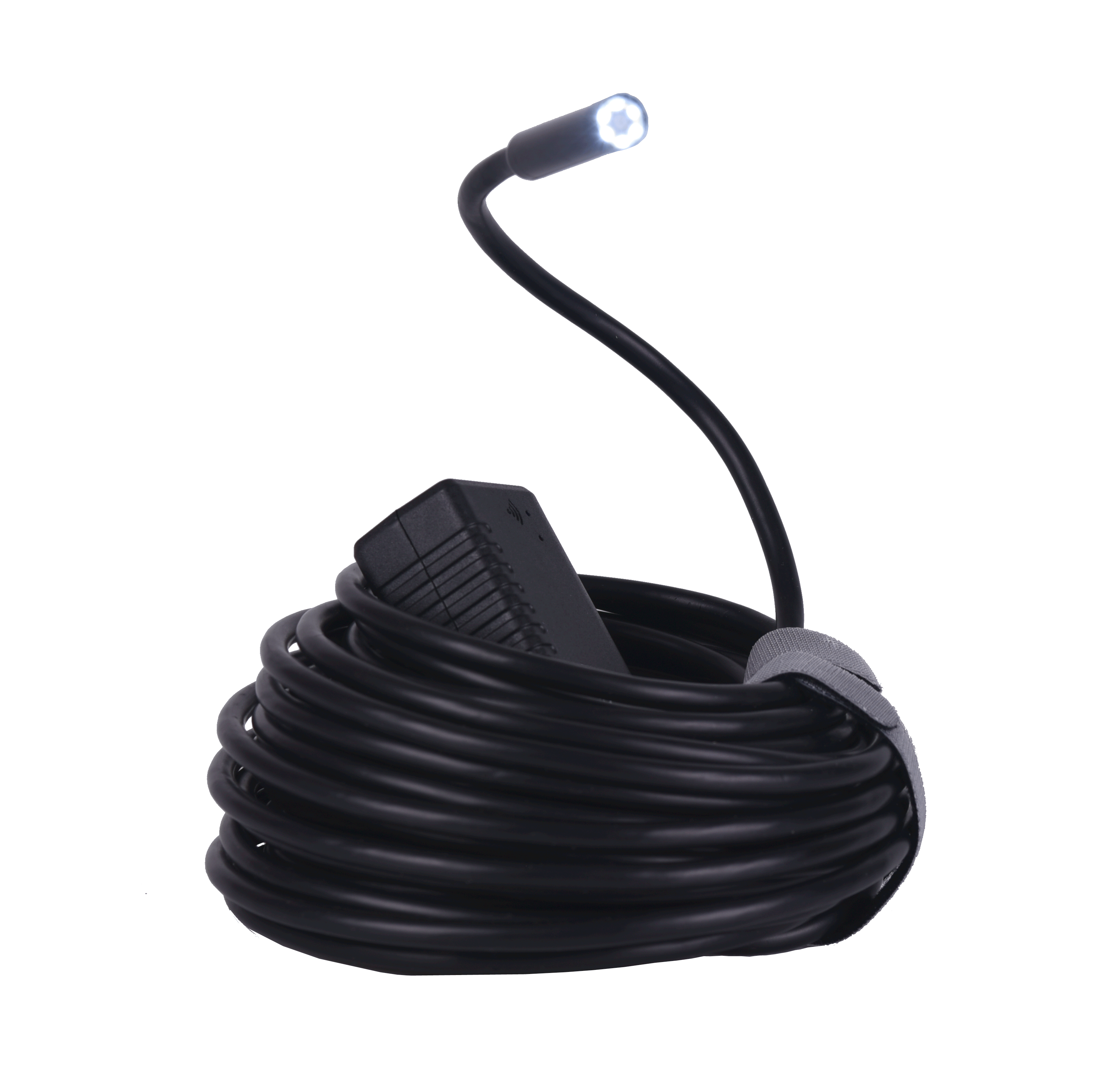A 16.5' semi-rigid cable connects to a lithium-ion battery that may last up to 4 hours. The battery end contains a dimmer switch for the LEDs and a WIFI transmitter that creates it's own hotspot. Connect to the camera hotspot with your iOS or Android device's WIFI and you can view the live stream at a smooth 30 frames per second, take snapshots, or record video.